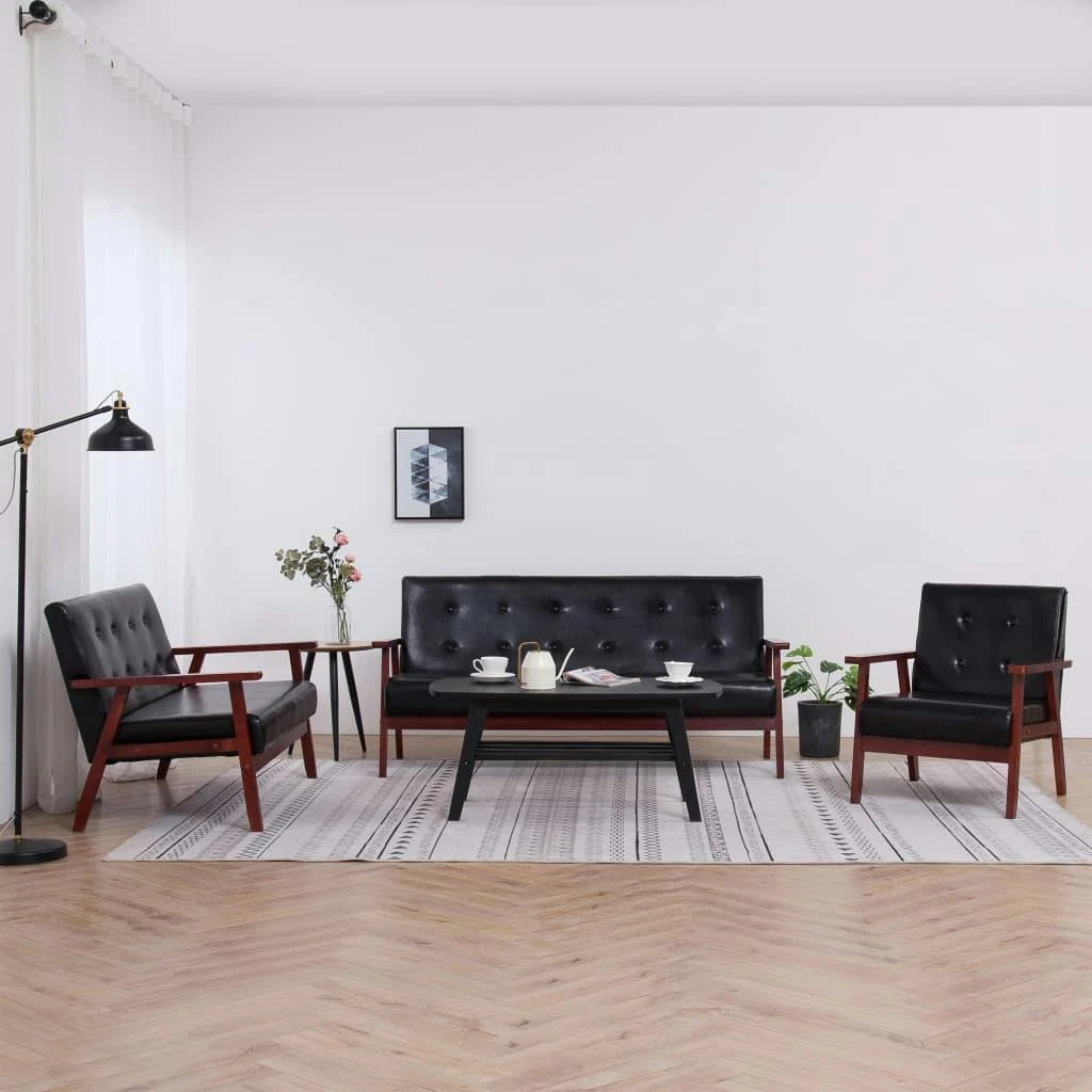 Diese äußerst bequeme Sofagarnitur weist ein schlichtes, skandinavisches Design auf und ist der ideale Sitzplatz zum Entspannen, Lesen, Fernsehen oder für ein nettes Pläuschchen. Die Sofagarnitur ist mit weichem Kunstleder bezogen und für zusätzlichen Komfort dick mit Schaumstoff gepolstert. Der Rahmen aus Massivholz verleiht dieser Sofagarnitur Stabilität und Langlebigkeit. Im Lieferumfang enthalten sind ein Sessel, ein 2-Sitzer und ein 3-Sitzer.