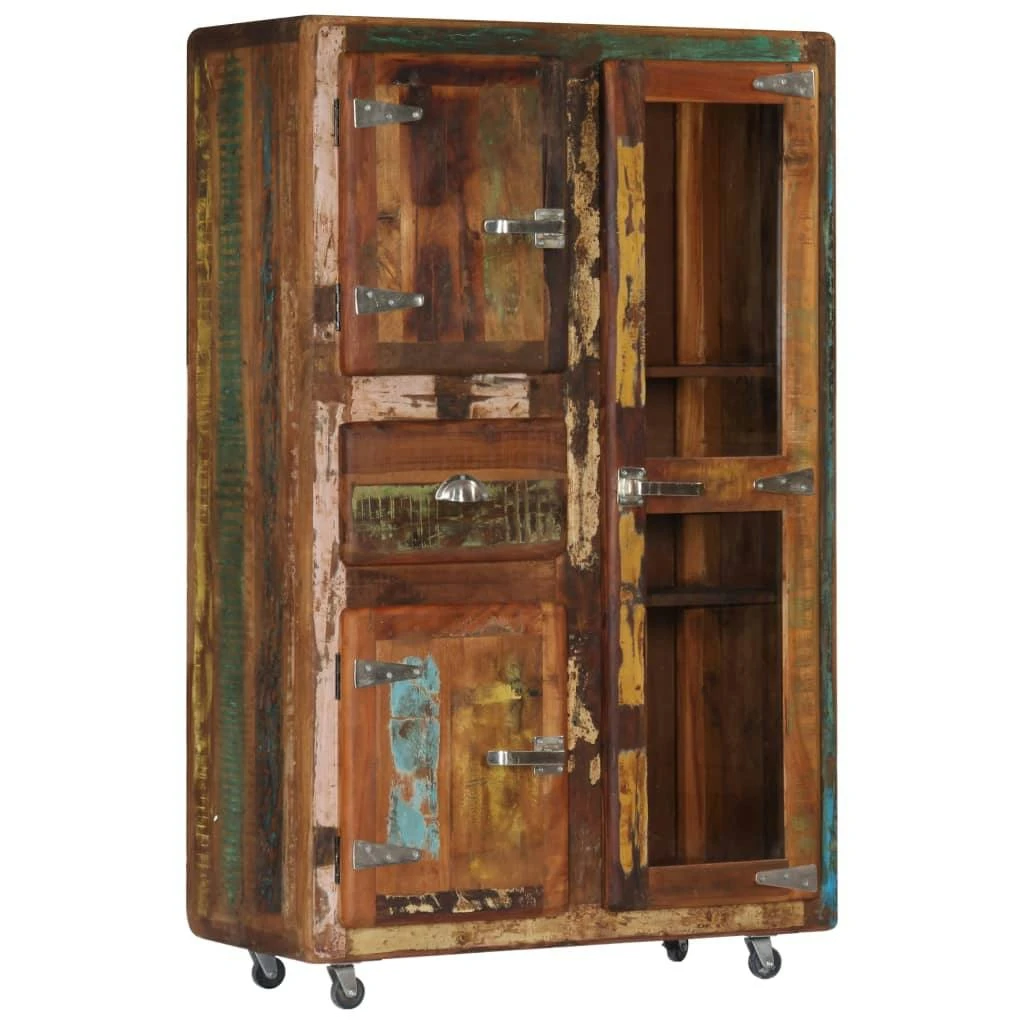 Dieses hölzerne Highboard versprüht Vintage-Charme und wird der Mittelpunkt in Ihrer Einrichtung sein. Das Holz-Highboard besteht aus massivem Altholz mit gemischten Farben. Das wiederverwertete Massivholz stammt aus Balken, Fußböden und Stützbalken aus alten, abgerissenen Gebäuden. Darüber hinaus kann es aus verschiedenen Holzarten wie Teakholz, Hartholz, Tropenholz, Mangoholz usw. bestehen. Dies bedeutet, dass das Massivholz die Eigenschaften dieser verschiedenen Holzarten beibehält. Altholz ist bereits gealtert, verwittert und getrocknet. Daher schrumpft oder verbiegt es sich nicht mehr. Dieser Seitenschrank verfügt außerdem über eine Tür, eine Schublade und zwei Regalfächer, die alle ausreichend Stauraum bieten. Wichtiger Hinweis: Farbe und Maserung variieren von Stück zu Stück, so dass jedes Möbelstück einzigartig ist. Die Lieferung erfolgt nach dem Zufallsprinzip.