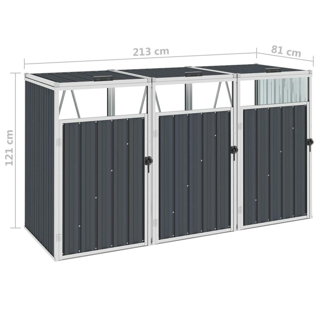 Bewahren Sie Ihre Mülltonnen außer Sichtweite im Garten auf und sorgen Sie mit unserer Mülltonnebox für Ordnung und Ästhetik in Ihren Außenbereichen! Diese Mülltonnenbox für drei Mülltonnen ist aus robustem, verzinktem Stahl gefertigt, wodurch sie sehr stabil und pflegeleicht ist. Sie ist mit drei Türen an der Vorderseite und schwarzen Kunststoff-Türgriffen ausgestattet. So können die Mülltonnen leicht herausgenommen und entleert werden. Die Box verfügt über drei Klappdeckel, die zum einfachen Einwerfen von Müll geöffnet werden können. Diese Mülltonnenbox ist zudem leicht zu montieren.Achtung: Dieses Produkt enthält mehrere Pakete. Wir versuchen, alles am selben Tag zu liefern, aber in einigen Fällen können Pakete an verschiedenen Tagen ankommen.