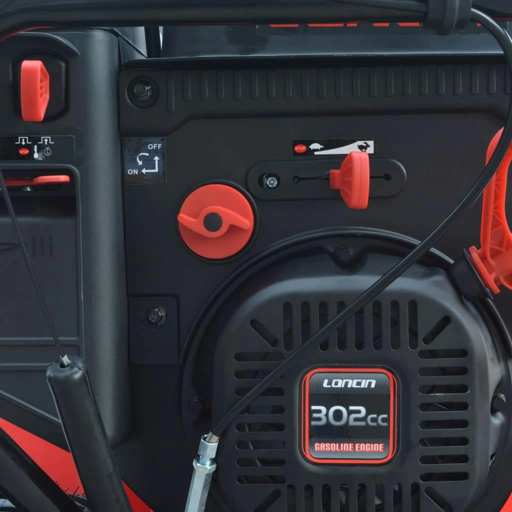 Diese zweistufige Schneefräse ist ideal für die Bewältigung anspruchsvoller Schneeräumungsaufgaben. Ausgestattet mit einem leistungsstarken 302 ccm Motor, bietet der Schneeräumer eine schnelle und effiziente Leistung. Die Schneefräse bietet zwei Startmodi zur Auswahl, manuell oder elektrisch. Das selbstfahrende Antriebssystem verfügt über 6 Vorwärts- und 2 Rückwärtsgänge, die das Fahren komfortabler machen. Die Rutsche hat einen Drehwinkel von 180°, so dass Sie den ausgeworfenen Schnee auf beide Seiten des Gerätes richten können. Die Maschine arbeitet zweistufig: In der ersten Stufe werden Schnee und Eis durch das robuste Schneckenblatt geschaufelt und zerkleinert; in der zweiten Stufe werden sie von einem Laufrad durch den Auswurfkamin ausgeworfen, so dass der Schnee gleichmäßig verteilt wird. Das Gebläse verfügt außerdem über eine Beleuchtungsfunktion, die Ihnen die Arbeit erleichtert. Die Montage ist einfach.
